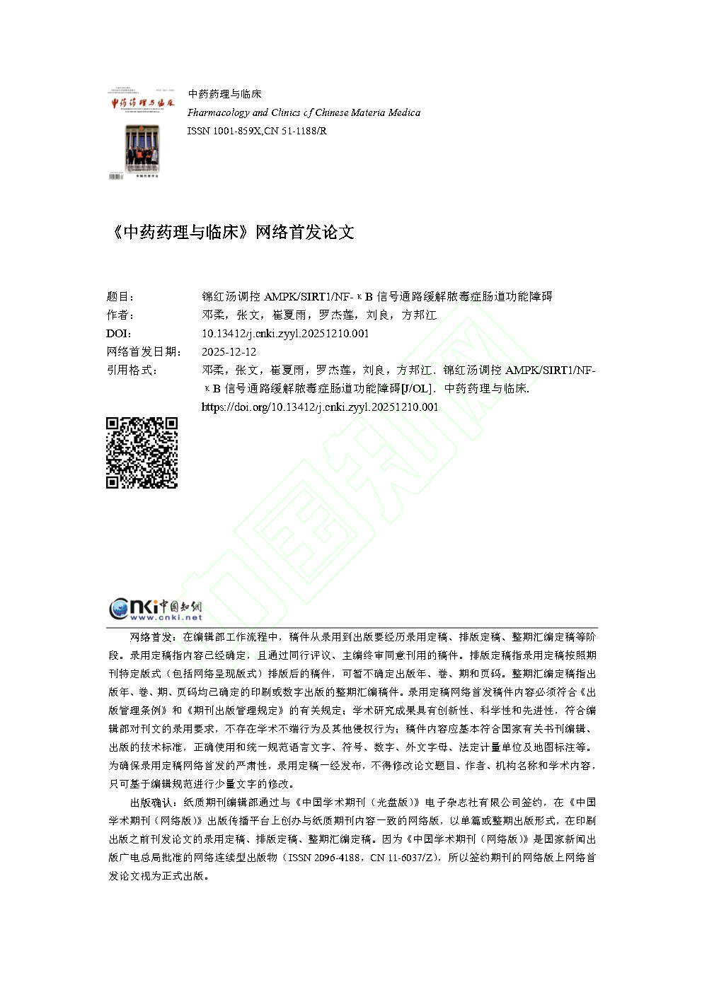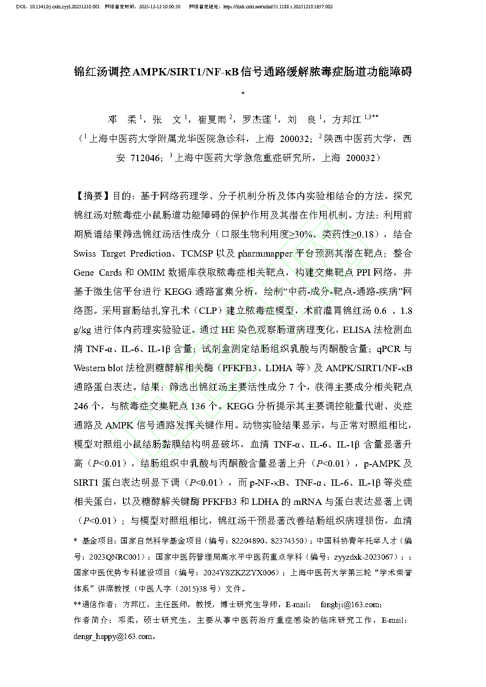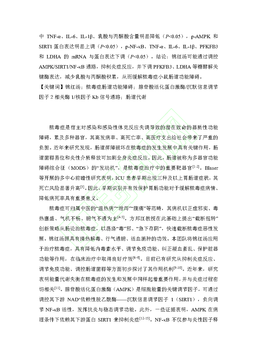 参考文献:略原文下载:锦红汤调控 AMPK/SIRT1/NF-κ B 信号通路缓解脓毒症肠道功能障碍